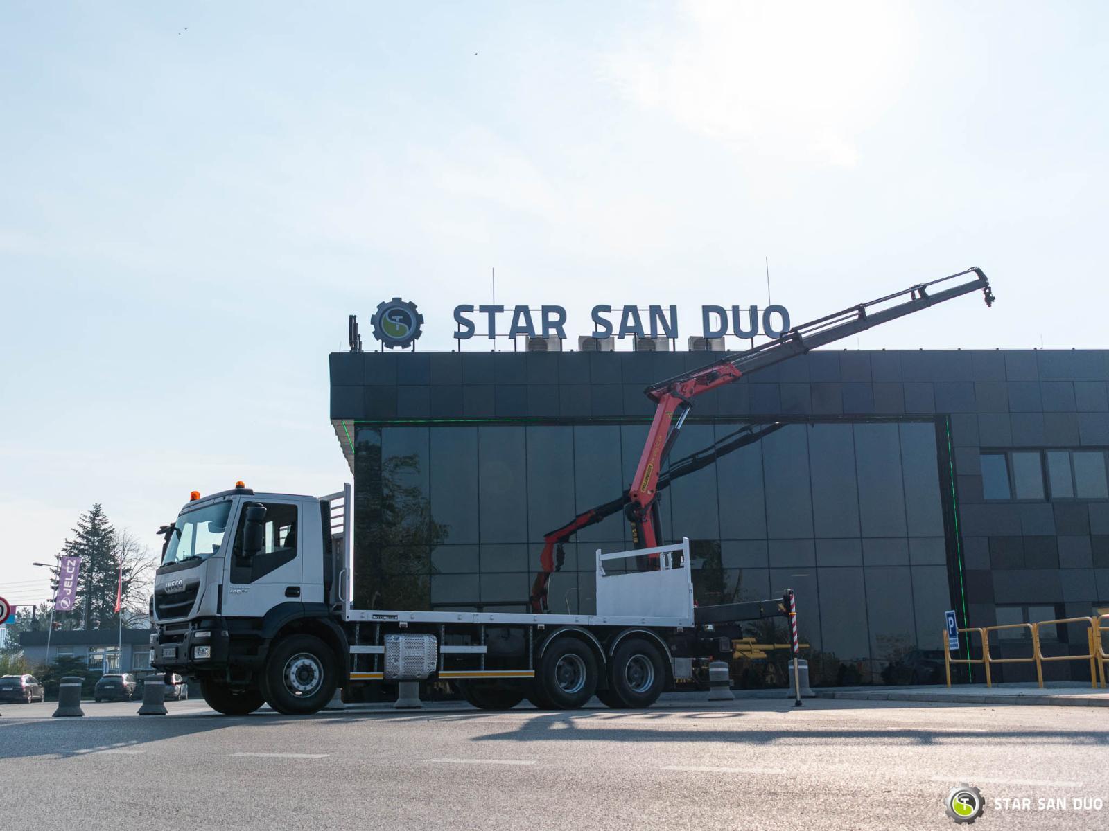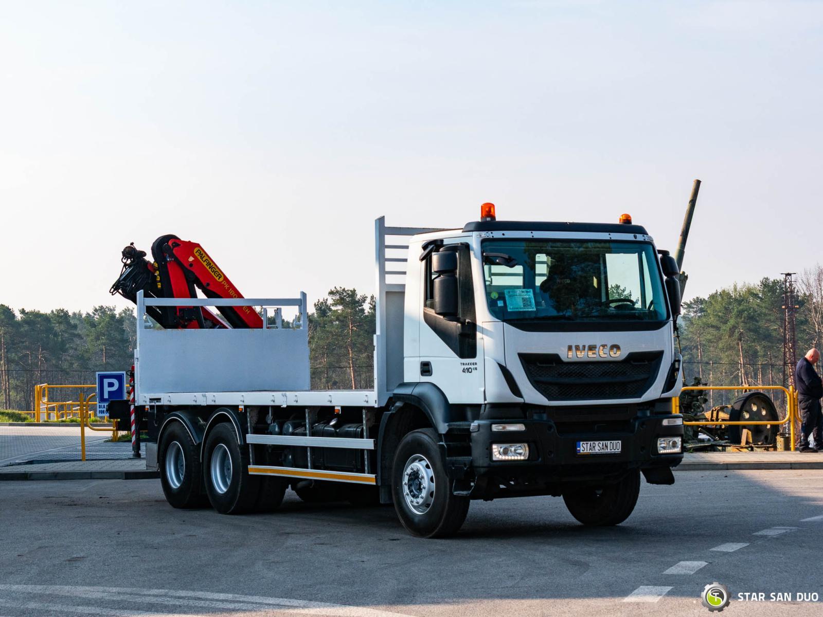 IVECO TRAKKER 410 6x4 PALFINGER PK 18002 EH ID No.: 1043 ________________________________________ Vehicle specifications: • IVECO TRAKKER 410 • VIN: WJME2NSS70C367533 • Drive: 6x4 • Year of manufacture: 2017 • First registration: 04.08.2017 • Engine power: 410 HP • Emission standard: Euro VI • Mileage: 223,294 km • Gearbox: Automatic ________________________________________ Crane specifications: • PALFINGER PK 18002 EH • 4 hydraulic lifts • Rotator • Radio control • Crane operating hours: 1,963 h ________________________________________ Technical parameters: • Curb weight: 15,255 kg • Permissible Gross Vehicle Weight (GVW) in Poland: 26,000 kg • Payload: 10,745 kg • Overall Length: 9,650 mm • Overall Height: 3,650 mm ________________________________________ Cargo Space Dimensions: • Length: 6,300 mm • Width: 2,470 mm • Height: ________________________________________ Wheelbase: • 1-2: 4,500 mm • 2-3: 1,395 mm ________________________________________ Additional Equipment: • ABS • Central Locking • CD • Electric Windows • Tow Bar • Immobilizer • On-board Computer • Factory Radio • Tachograph • Power Steering • Air Conditioning ________________________________________ Additional Options: • Box Body • Possibility of paid retrofitting with aluminum or steel side boards. ________________________________________ Services: • Authorized service for FASSI cranes, HIAB, EFFER, and others • Repairs of all brands of cranes and trucks • Spare parts available ________________________________________ Technical inspections and certificates: • We are authorized by the Office of Technical Inspection (UDT) • We conduct inspections and coordinate documentation with UDT • We conduct initial vehicle technical inspections at Diagnostic Stations ________________________________________ Warranty and preparation for operation: • Possibility to purchase a technical warranty for an additional fee • Professional preparation of the vehicle and crane for operation ________________________________________ Financing: We offer assistance in arranging leasing or a loan for the purchase of a vehicle – ask us for details. ________________________________________ Location: Our office is in Starachowice. We invite you to inspect the vehicle in person and take a test drive. ________________________________________ Additional information: Why choose us? • Experience and professionalism: We have been selling and servicing 4x4, 6x6, and 8x8 off-road vehicles for years. • Comprehensive service: We provide support with vehicle purchase, financing, and maintenance. • Quality guarantee: Each vehicle undergoes a detailed pre-sale inspection, guaranteeing its reliability and roadworthiness. ________________________________________ You can find more offers on our sales platform: www.starsanduo-trucks.com ________________________________________ Don't wait – contact us today and schedule a vehicle viewing! ________________________________________ Legal information: This announcement is for informational purposes only and does not constitute an offer within the meaning of Article 66 § 1 of the Civil Code. Our company is not responsible for minor errors, incomplete information, or outdated information.