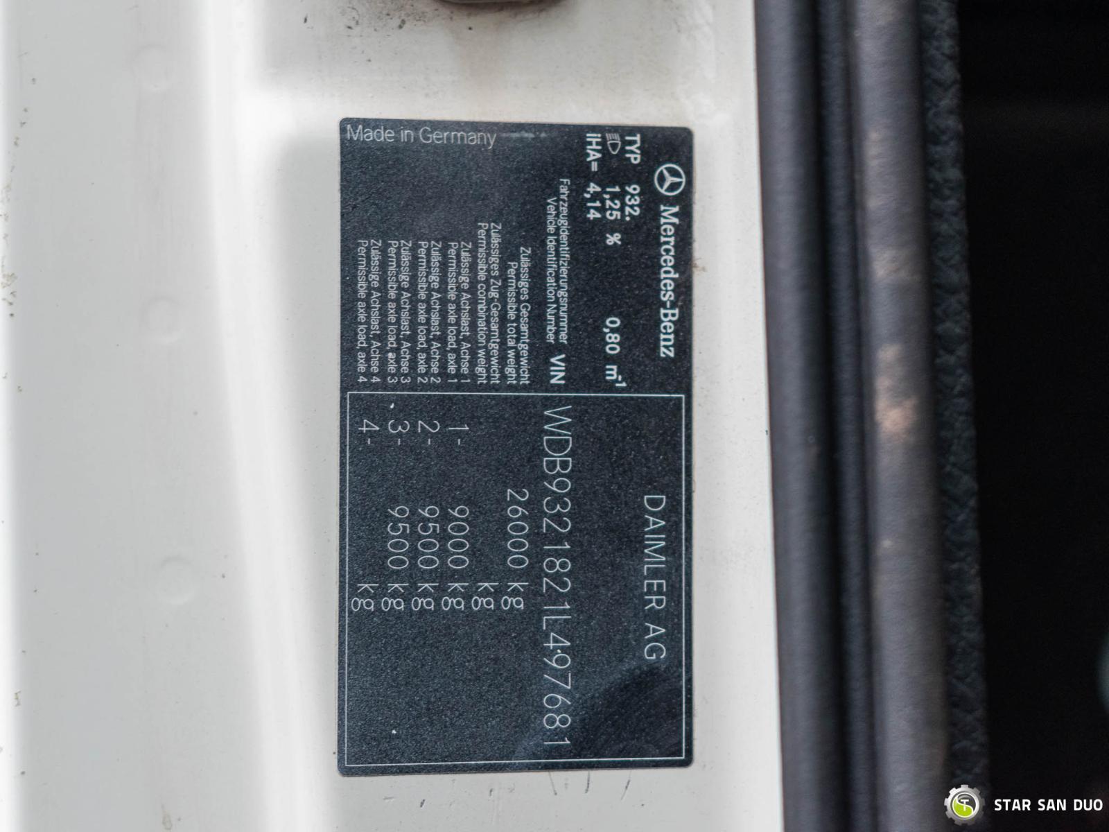 MERCEDES-BENZ ACTROS 3348 6x6 PALFINGER PK 40002 EH ID nr: 1021 ________________________________________ Dane techniczne pojazdu: • MERCEDES-BENZ ACTROS 3348 • VIN: WDB9321821L497681 • Napęd: 6x6 • Rok produkcji: 2010 • Pierwsza rejestracja: 26.10.2010 • Moc silnika: 480 KM • Norma spalin: Euro V • Przebieg: 212 081 km • Skrzynia biegów: Automatyczna ________________________________________ Specyfikacja żurawia: • PALFINGER PK 40002 EH • 5 segmentów hydraulicznych • Kosz roboczy • Sterowanie radiowe • Motogodziny żurawia: 3 037,3 h ________________________________________ Parametry techniczne: • Masa własna: 19 315 kg • Dopuszczalna masa całkowita (DMC) na Polskę: 26 000 kg • Ładowność: 6 685 kg • Długość całkowita pojazdu: 8 240 mm • Wysokość całkowita pojazdu: 3 950 mm ________________________________________ Wymiary przestrzeni ładunkowej: • Długość: 4 000 mm • Szerokość: 2 480 mm • Wysokość: 600 mm ________________________________________ Rozstaw osi: • Oś 1–2: 3 600 mm • Oś 2–3: 1 350 mm ________________________________________ Zawieszenie: • Przód: mechaniczne • Tył: mechaniczne ________________________________________ Wyposażenie dodatkowe: • ABS • Centralny zamek • CD • Elektryczne szyby • Hak/Zaczep • Immobilizer • Komputer pokładowy • Radio fabryczne • Tachograf • Wspomaganie kierownicy • Klimatyzacja ________________________________________ Opcje dodatkowe: • Pojazd wyposażony w kosz roboczy ________________________________________ Usługi serwisowe: • Autoryzowany serwis żurawi marek FASSI, HIAB, EFFER i innych • Naprawy żurawi wszystkich marek oraz samochodów ciężarowych • Dostępność części zamiennych ________________________________________ Badania techniczne i certyfikaty: • Posiadamy uprawnienia Urzędu Dozoru Technicznego (UDT) • Przeprowadzamy badania dozorowe i uzgadniamy dokumentację z UDT • Realizujemy pierwsze badania techniczne pojazdu na Stacjach Diagnostycznych ________________________________________ Gwarancja i przygotowanie do eksploatacji: • Możliwość zakupu gwarancji technicznej za dopłatą • Profesjonalne przygotowanie pojazdu i żurawia do pracy ________________________________________ Finansowanie: Oferujemy pomoc w organizacji leasingu lub kredytu na zakup pojazdu – zapytaj nas o szczegóły. ________________________________________ Lokalizacja: Nasza siedziba znajduje się w Starachowicach. Zapraszamy do osobistego sprawdzenia pojazdu i przeprowadzenia jazdy testowej. ________________________________________ Informacje dodatkowe: Dlaczego warto wybrać naszą ofertę? • Doświadczenie i profesjonalizm: od lat zajmujemy się sprzedażą i serwisem pojazdów terenowych 4x4, 6x6, 8x8. • Kompleksowa obsługa: zapewniamy wsparcie przy zakupie, finansowaniu i serwisowaniu pojazdu. • Gwarancja jakości: każdy pojazd przechodzi szczegółowy przegląd przed sprzedażą, co gwarantuje jego sprawność i niezawodność. ________________________________________ Więcej ofert znajdą Państwo na naszej platformie sprzedażowej: www.starsanduo-trucks.com ________________________________________ Nie czekaj – skontaktuj się z nami już dziś i umów na prezentację pojazdu! ________________________________________ Informacje prawne: Niniejsze ogłoszenie ma charakter wyłącznie informacyjny i nie stanowi oferty w rozumieniu art. 66 § 1 Kodeksu cywilnego. Nasza firma nie ponosi odpowiedzialności za drobne błędy, niepełne informacje lub nieaktualność ogłoszenia.