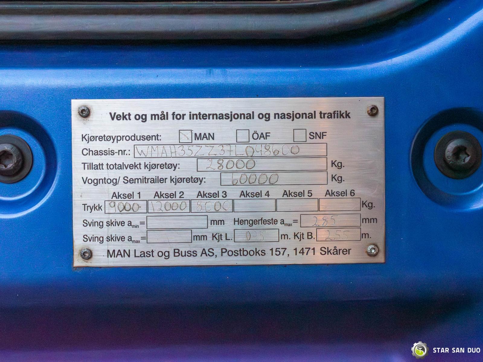 MAN TGA 26.440 6x4 HIAB 322-6 HIPRO ID nr: 966 ________________________________________ Dane techniczne pojazdu: • Model: MAN TGA 26.440 • VIN: WMAH35ZZ37L048600 • Napęd: 6x4 • Rok produkcji: 2007 • Pierwsza rejestracja: 14.08.2007 • Moc silnika: 440 KM • Norma spalin: Euro IV • Przebieg: 201 437 km • Skrzynia biegów: manualna ________________________________________ Specyfikacja żurawia: • HIAB 322-6 HIPRO • 6 segmentów hydraulicznych • Fly Jib – 4 segmenty • Sterowanie radiowe ________________________________________ Parametry techniczne: • Masa własna: 18 340 kg • Ładowność: 7 660 kg • Dopuszczalna masa całkowita (DMC) na Polskę: 26 000 kg ________________________________________ Wymiary przestrzeni ładunkowej: (hydraulicznie rozsuwana wszerz i wzdłuż) • Długość: 6500 mm • Szerokość: 2450 mm • Wysokość: 800 mm ________________________________________ Rozstaw osi: • Oś 1–2: 4800 mm • Oś 2–3: 1350 mm ________________________________________ Zawieszenie przód / tył: • M / M ________________________________________ Wyposażenie dodatkowe: • ABS • Centralny zamek • CD • Elektryczne szyby • Hak/Zaczep • Immobilizer • Komputer pokładowy • Radio fabryczne • Tachograf • Wspomaganie kierownicy • Klimatyzacja ________________________________________ Opcje dodatkowe: • — ________________________________________ Usługi serwisowe: • Autoryzowany serwis żurawi marek FASSI, HIAB, EFFER i innych • Naprawy żurawi wszystkich marek oraz samochodów ciężarowych • Dostępność części zamiennych ________________________________________ Badania techniczne i certyfikaty: • Posiadamy uprawnienia Urzędu Dozoru Technicznego (UDT) • Przeprowadzamy badania dozorowe i uzgadniamy dokumentację z UDT • Realizujemy pierwsze badania techniczne pojazdu na Stacjach Diagnostycznych ________________________________________ Gwarancja i przygotowanie do eksploatacji: • Możliwość zakupu gwarancji technicznej za dopłatą • Profesjonalne przygotowanie pojazdu i żurawia do pracy ________________________________________ Finansowanie: Oferujemy pomoc w organizacji leasingu lub kredytu na zakup pojazdu – zapytaj nas o szczegóły. ________________________________________ Lokalizacja: Nasza siedziba znajduje się w Starachowicach. Zapraszamy do osobistego sprawdzenia pojazdu i przeprowadzenia jazdy testowej. ________________________________________ Informacje dodatkowe: Dlaczego warto wybrać naszą ofertę? • Doświadczenie i profesjonalizm: od lat zajmujemy się sprzedażą i serwisem pojazdów terenowych 4x4, 6x6, 8x8. • Kompleksowa obsługa: zapewniamy wsparcie przy zakupie, finansowaniu i serwisowaniu pojazdu. • Gwarancja jakości: każdy pojazd przechodzi szczegółowy przegląd przed sprzedażą, co gwarantuje jego sprawność i niezawodność. ________________________________________ Więcej ofert znajdą Państwo na naszej platformie sprzedażowej: www.starsanduo-trucks.com ________________________________________ Nie czekaj – skontaktuj się z nami już dziś i umów na prezentację pojazdu! ________________________________________ Informacje prawne: Niniejsze ogłoszenie ma charakter wyłącznie informacyjny i nie stanowi oferty w rozumieniu art. 66 §1 Kodeksu cywilnego. Nasza firma nie ponosi odpowiedzialności za drobne błędy, niepełne informacje lub nieaktualność ogłoszenia.