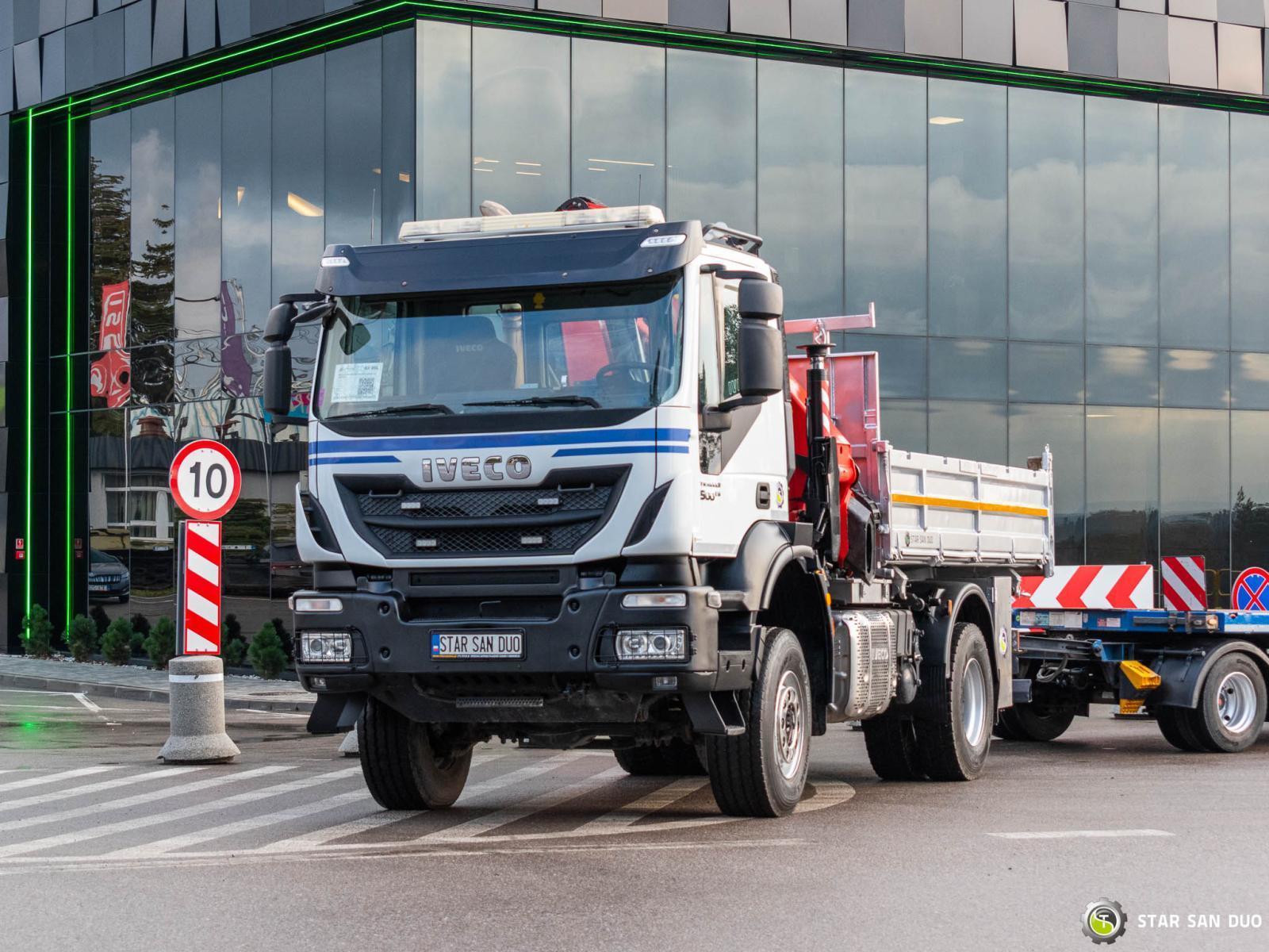 IVECO TRAKKER 450 4x4 PALFINGER PK 23001 EH + SCHWARZMÜLLER TRAILER ID No.: 992 ________________________________________ Vehicle specifications: • IVECO Trakker 450 • VIN: WJMB1VS70C317959 • Drive: 4x4 • Year of manufacture: 2015 • First registration: 28/08/2015 • Engine power: 450 HP • Emission standard: Euro VI • Mileage: 171,514 km • Gearbox: manual ____________________________________________________ Crane specifications: • PALFINGER PK 23001 EH • 5 hydraulic segments • Radio control ____________________________________________________ Vehicle specifications: • Kerb weight: 14,915 kg • Permissible gross vehicle weight (GVW) for Poland: 18,000 kg • Payload: 3,085 kg ________________________________________ Cargo space dimensions: • Length: 3,800 mm • Width: 2,450 mm • Height: 600 mm ________________________________________ Trailer: • Manufacturer: SCHWARZMÜLLER • Type: box trailer • Year of manufacture: 2016 • Unladen weight: 6,230 kg • Permissible gross vehicle weight (GVW): 24,000 kg • Cargo space dimensions: – Length: 8,100 mm – Width: 2,510 mm – Height: 900 mm ________________________________________ Additional equipment: • ABS • Central locking • CD player • Electric windows • Towbar • Immobilizer • On-board computer • Factory radio • Tachograph • Power steering steering wheel • Air conditioning ________________________________________ Additional options: • Vehicle + trailer combination • Platform body ________________________________________ Services: • Authorized service for cranes from FASSI, HIAB, EFFER, and others • Repairs of all brands of cranes and trucks • Spare parts availability ________________________________________ Technical inspections and certificates: • We are authorized by the Office of Technical Inspection (UDT) • We conduct inspections and coordinate documentation with UDT • We conduct initial technical inspections of vehicles at Diagnostic Stations ________________________________________ Warranty and preparation for operation: • Possibility to purchase a technical warranty for an additional fee • Professional preparation of the combination for operation ________________________________________ Financing: We offer assistance in arranging leasing or a loan for the purchase of the combination – ask us for details. ________________________________________ Location: Our headquarters is located in Starachowice. We invite you to inspect the vehicle in person and take it for a test drive. ________________________________________ Additional information: Why choose our offer? • Experience and professionalism – sales and service of specialized equipment • Comprehensive service – sales, financing, service • Quality guarantee – each vehicle undergoes a detailed inspection ________________________________________ You can find more offers on our sales platform: www.starsanduo-trucks.com ________________________________________ Legal information: This announcement is for informational purposes only and does not constitute an offer within the meaning of Article 66 § 1 of the Civil Code. Our company is not responsible for minor errors, incomplete information, or outdated information.