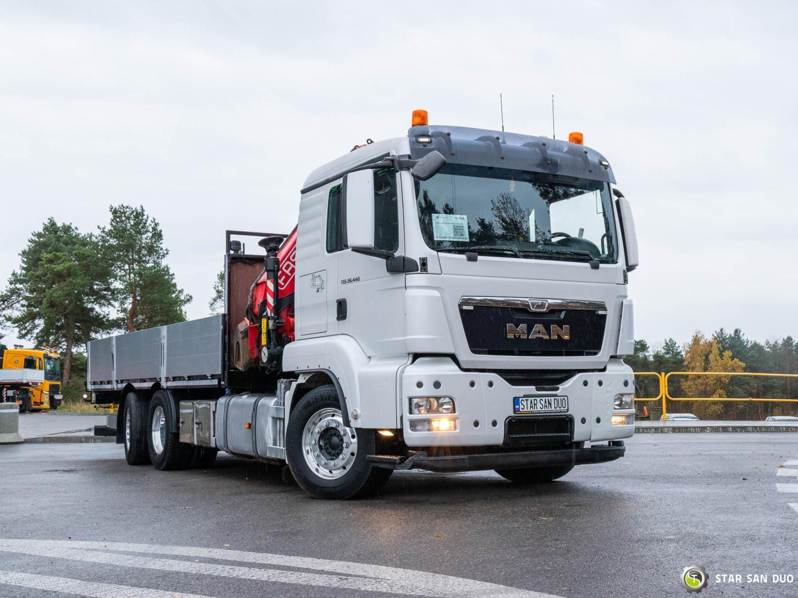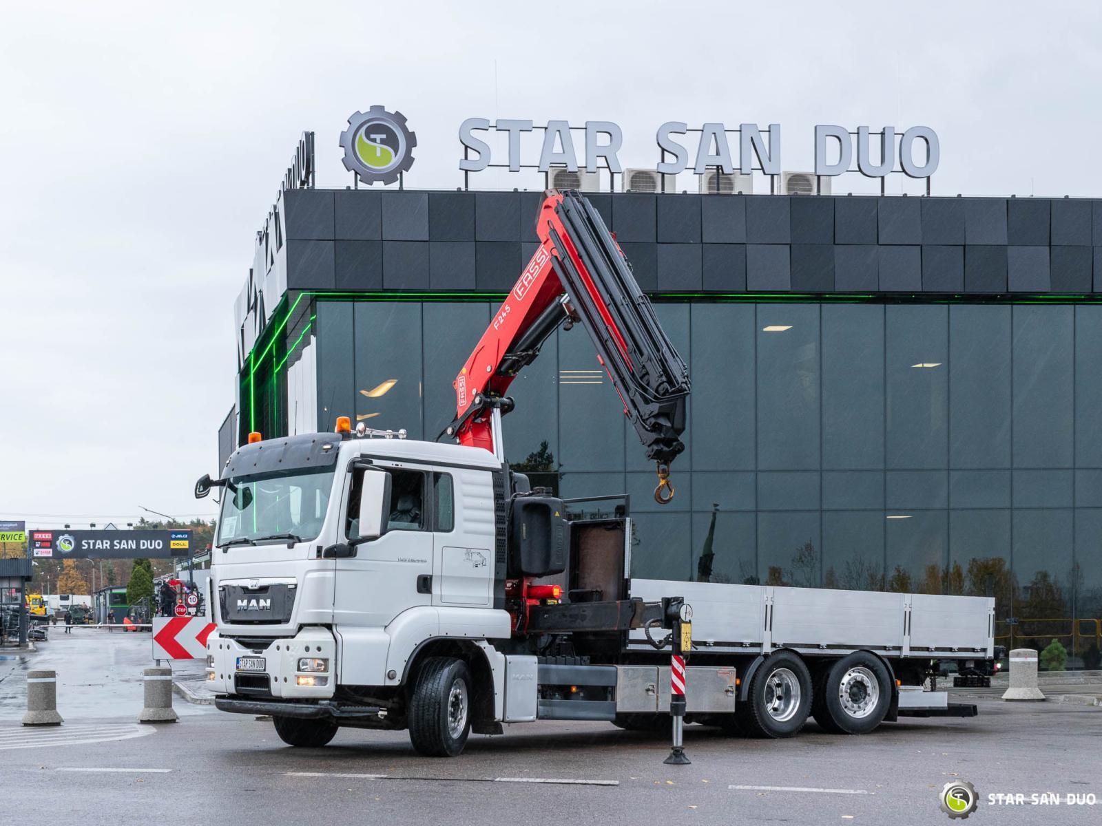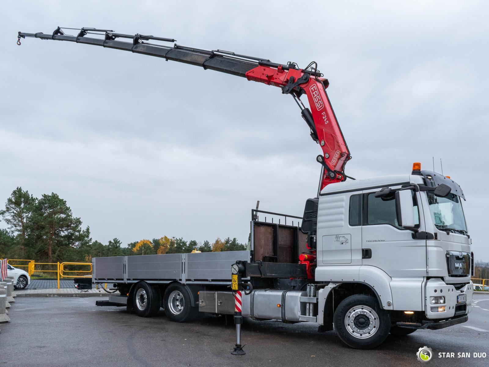 MAN TGS 26.440 6x2 FASSI F245A.2.28 ID No.: 943 ________________________________________ Vehicle specifications: • Model: MAN TGS 26.440 • VIN: WMA18S223EP051780 • Drive: 6x2 (last axle lifting and steered) • Year of manufacture: 2014 • First registration: 29/04/2014 • Engine power: 440 HP • Emission standard: Euro 5 • Mileage: 301,223 km • Gearbox: automatic • Suspension: mechanical front / air rear ____________________________________________________ Crane specifications: • FASSI F245A.2.28 • 8 hydraulic segments • Radio control ____________________________________________________ Technical parameters: • Curb weight: 11,875 kg • Payload: 14,125 kg • Gross vehicle weight (GVW) in Poland: 26,000 kg ________________________________________ Cargo space dimensions: • Length: 6,200 mm • Width: 2,460 mm • Height: 600 mm ________________________________________ Wheelbase: • 4,800 + 1,370 mm ________________________________________ Additional equipment: • ABS • Air conditioning • Central locking • Electric windows • Hook/catch • Immobilizer • On-board computer • Factory radio • Tachograph • Power steering ________________________________________ Additional options: • Vehicle with a dump body and a FASSI F245A.2.28 crane ________________________________________ Services: • Authorized service for FASSI, HIAB, EFFER and Other • Repairs of all brands of cranes and trucks • Spare parts available ________________________________________ Technical inspections and certificates: • We are authorized by the Office of Technical Inspection (UDT) • We conduct inspections and coordinate documentation with UDT • We conduct initial vehicle technical inspections at Diagnostic Stations ________________________________________ Warranty and preparation for operation: • Possibility to purchase a technical warranty for an additional fee • Professional preparation of the vehicle and crane for operation ________________________________________ Financing: We offer assistance in arranging leasing or a loan for the purchase of a vehicle – ask us for details. ________________________________________ Location: Our office is in Starachowice. We invite you to inspect the vehicle in person and take a test drive. ________________________________________ Additional information: Why choose our offer? • Experience and professionalism: We have been selling and servicing 4x4, 6x4, 6x6, and 8x8 off-road vehicles for years. • Comprehensive service: We provide support with vehicle purchase, financing, and maintenance. • Quality guarantee: Each vehicle undergoes a detailed pre-sale inspection, guaranteeing its reliability and roadworthiness. ________________________________________ You can find more offers on our sales platform: www.starsanduo-trucks.com ________________________________________ Legal information: This announcement is for informational purposes only and does not constitute an offer within the meaning of Article 66 § 1 of the Civil Code. Our company is not responsible for minor errors, incomplete information, or outdated information.
