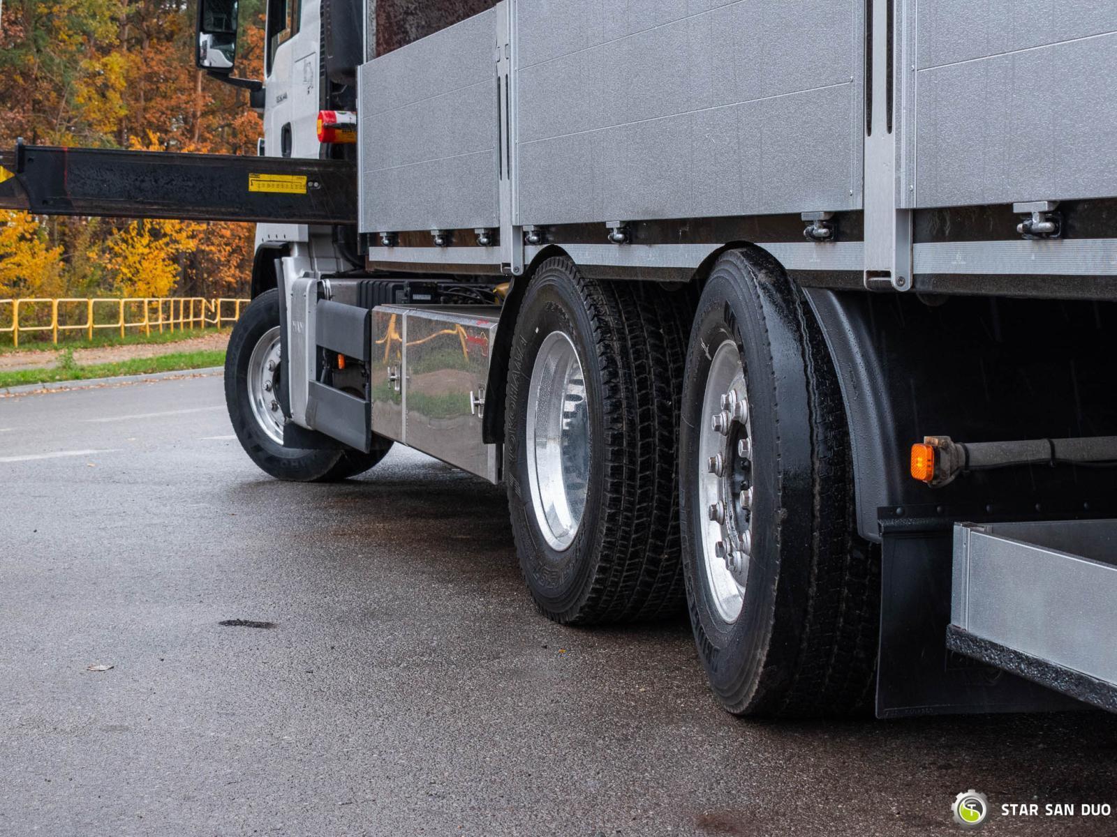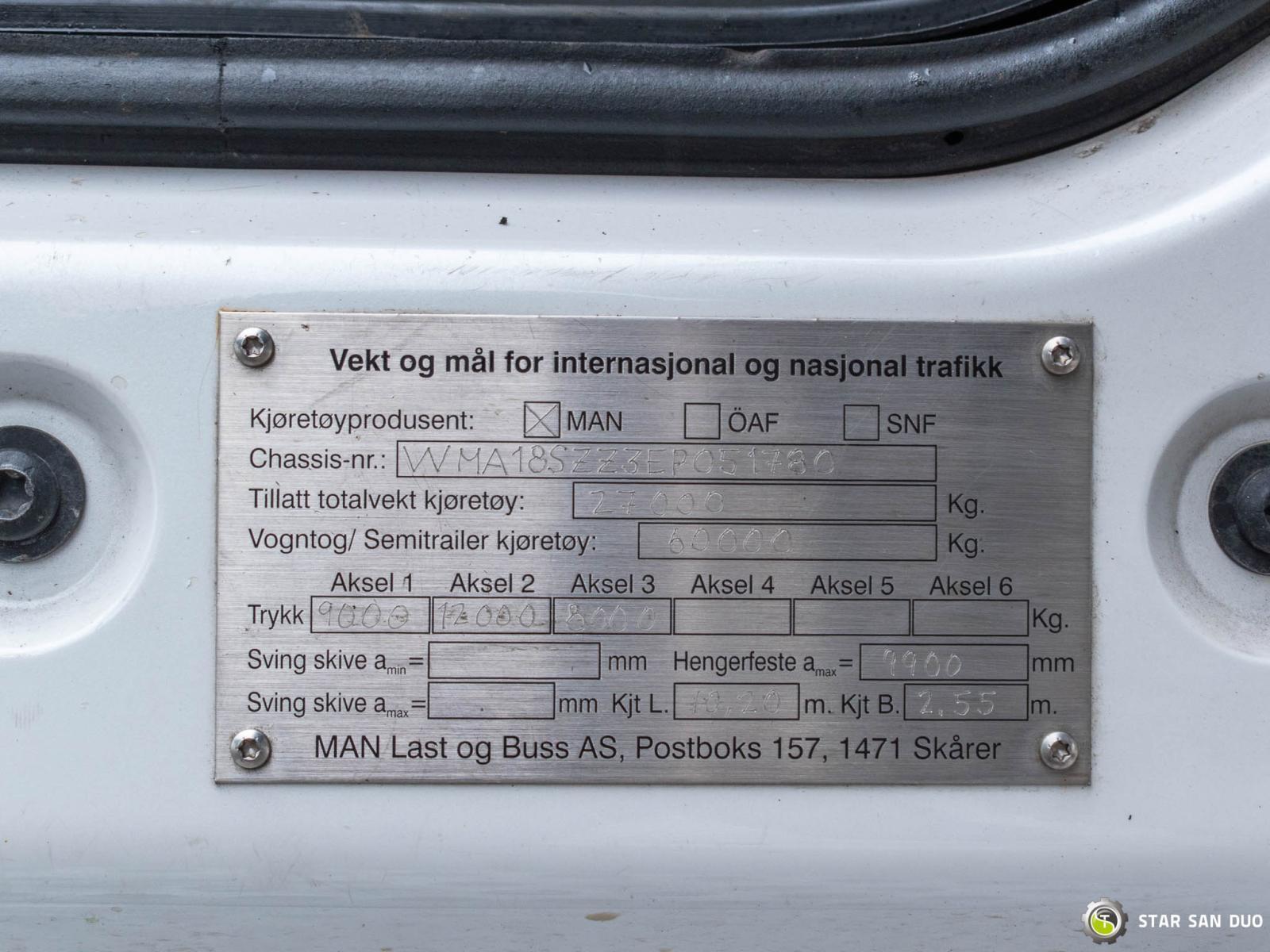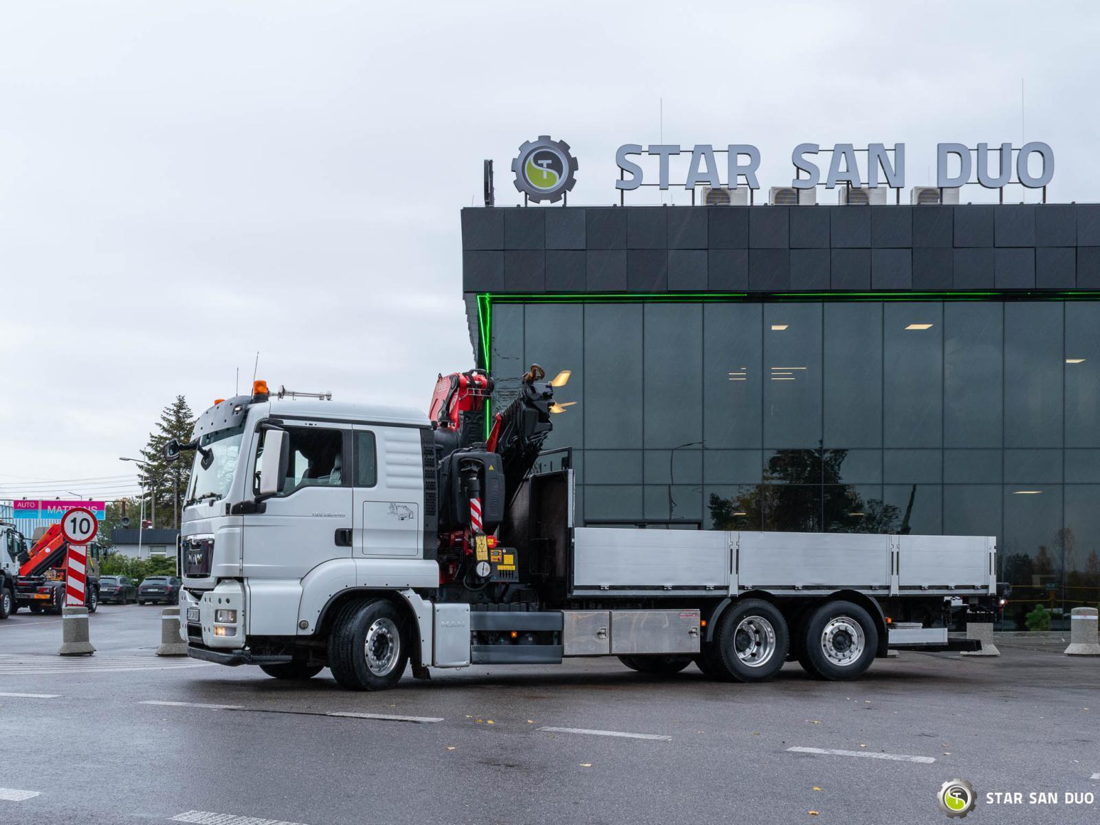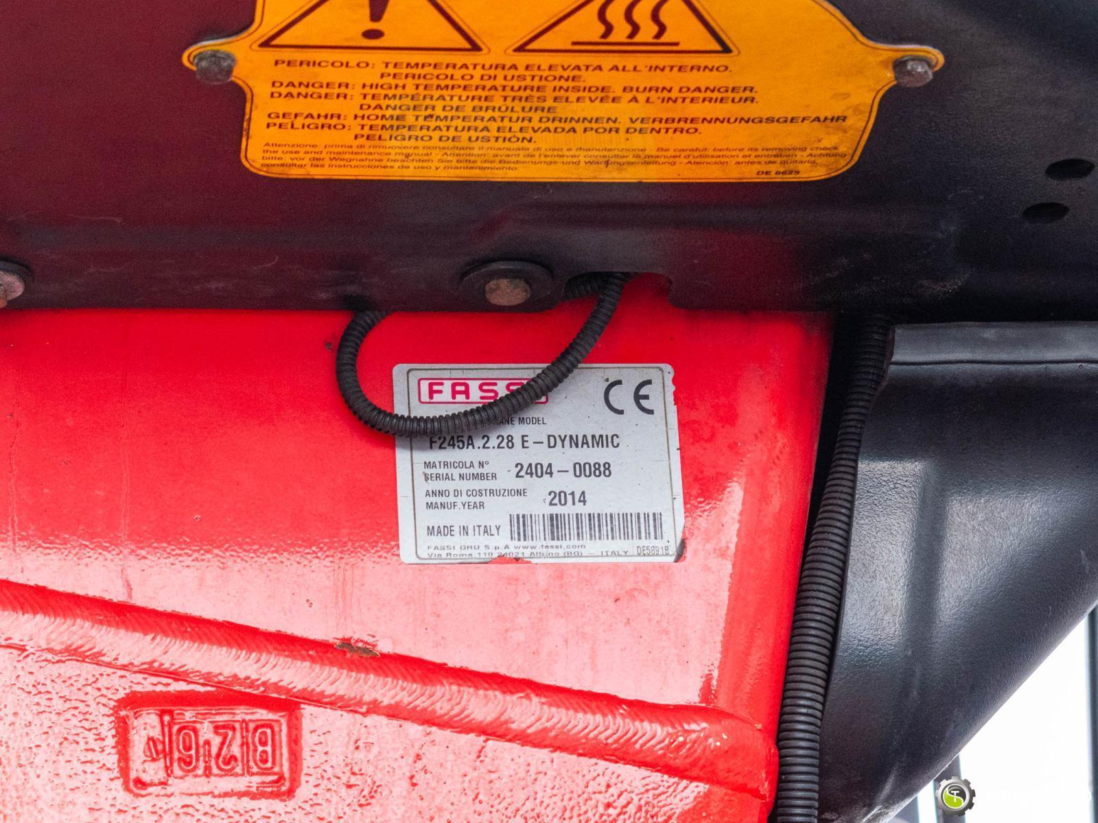 MAN TGS 26.440 6x2 FASSI F245A.2.28 ID No.: 943 ________________________________________ Vehicle specifications: • Model: MAN TGS 26.440 • VIN: WMA18S223EP051780 • Drive: 6x2 (last axle lifting and steered) • Year of manufacture: 2014 • First registration: 29/04/2014 • Engine power: 440 HP • Emission standard: Euro 5 • Mileage: 301,223 km • Gearbox: automatic • Suspension: mechanical front / air rear ____________________________________________________ Crane specifications: • FASSI F245A.2.28 • 8 hydraulic segments • Radio control ____________________________________________________ Technical parameters: • Curb weight: 11,875 kg • Payload: 14,125 kg • Gross vehicle weight (GVW) in Poland: 26,000 kg ________________________________________ Cargo space dimensions: • Length: 6,200 mm • Width: 2,460 mm • Height: 600 mm ________________________________________ Wheelbase: • 4,800 + 1,370 mm ________________________________________ Additional equipment: • ABS • Air conditioning • Central locking • Electric windows • Hook/catch • Immobilizer • On-board computer • Factory radio • Tachograph • Power steering ________________________________________ Additional options: • Vehicle with a dump body and a FASSI F245A.2.28 crane ________________________________________ Services: • Authorized service for FASSI, HIAB, EFFER and Other • Repairs of all brands of cranes and trucks • Spare parts available ________________________________________ Technical inspections and certificates: • We are authorized by the Office of Technical Inspection (UDT) • We conduct inspections and coordinate documentation with UDT • We conduct initial vehicle technical inspections at Diagnostic Stations ________________________________________ Warranty and preparation for operation: • Possibility to purchase a technical warranty for an additional fee • Professional preparation of the vehicle and crane for operation ________________________________________ Financing: We offer assistance in arranging leasing or a loan for the purchase of a vehicle – ask us for details. ________________________________________ Location: Our office is in Starachowice. We invite you to inspect the vehicle in person and take a test drive. ________________________________________ Additional information: Why choose our offer? • Experience and professionalism: We have been selling and servicing 4x4, 6x4, 6x6, and 8x8 off-road vehicles for years. • Comprehensive service: We provide support with vehicle purchase, financing, and maintenance. • Quality guarantee: Each vehicle undergoes a detailed pre-sale inspection, guaranteeing its reliability and roadworthiness. ________________________________________ You can find more offers on our sales platform: www.starsanduo-trucks.com ________________________________________ Legal information: This announcement is for informational purposes only and does not constitute an offer within the meaning of Article 66 § 1 of the Civil Code. Our company is not responsible for minor errors, incomplete information, or outdated information.
