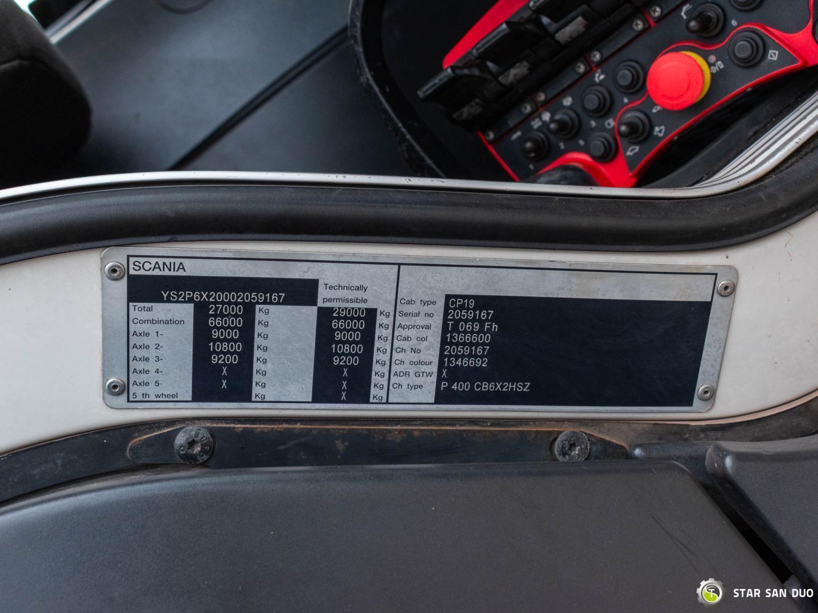 SCANIA P400 6x2 PALFINGER PK 26002 ID No.: 967 ________________________________________ Vehicle Specifications: • Model: Scania P400 • VIN: YS2P6X20002059167 • Drive: 6x2 • Year of manufacture: 2010 • First registration: October 29, 2010 • Engine power: 400 HP • Emission standard: Euro 5 • Mileage: 398,800 km • Transmission: automatic • Gross vehicle weight (GVW) in Poland: 26,000 kg • Curb weight: 16,255 kg • Payload: 9,745 kg • Color: white ________________________________________ Crane Specifications: • Model: Palfinger PK 26002 • 6 sections Hydraulics • Radio control ________________________________________ Technical parameters: • Wheelbase: 4500 / 1315 mm • Liftable and steerable rear axle ________________________________________ Loading space dimensions: • Length: 5100 mm • Width: 2550 mm • Height: 800 mm ________________________________________ Additional equipment: • ABS • Central locking • Electric windows • Air conditioning • On-board computer • Factory radio • Tachograph • Power steering ________________________________________ Additional options: • Tipper ________________________________________ Services: • Authorized service for cranes from FASSI, HIAB, EFFER, and others • Repairs of all crane brands and trucks • Spare parts availability ________________________________________ Technical inspections and certificates: • We are authorized by the Office of Technical Inspection (UDT) • We perform inspections We conduct inspections and coordinate documentation with the Office of Technical Inspection (UDT) • We conduct initial vehicle inspections at Diagnostic Stations ________________________________________ Warranty and preparation for operation: • Possibility to purchase a technical warranty for an additional fee • Professional preparation of the vehicle and crane for operation ________________________________________ Financing: We offer assistance in arranging leasing or a loan for the purchase of a vehicle – ask us for details. ________________________________________ Location: Our headquarters is in Starachowice. We invite you to inspect the vehicle in person and take a test drive. ________________________________________ Additional information: Why choose our offer? • Experience and professionalism – we have been selling and servicing 4x4, 6x6, and 8x8 off-road vehicles for years. • Comprehensive service – we provide support with the purchase, financing, and servicing of the vehicle. • Quality guarantee – each vehicle undergoes a detailed pre-sale inspection, guaranteeing its operational reliability and reliability. ________________________________________ You can find more offers on our sales platform: www.starsanduo-trucks.com ________________________________________ Don't wait – contact us today and schedule a vehicle viewing! ________________________________________ Legal information: This announcement is for informational purposes only and does not constitute an offer within the meaning of Article 66 § 1 of the Civil Code. Our company is not responsible for minor errors, incomplete information, or out-of-date information.