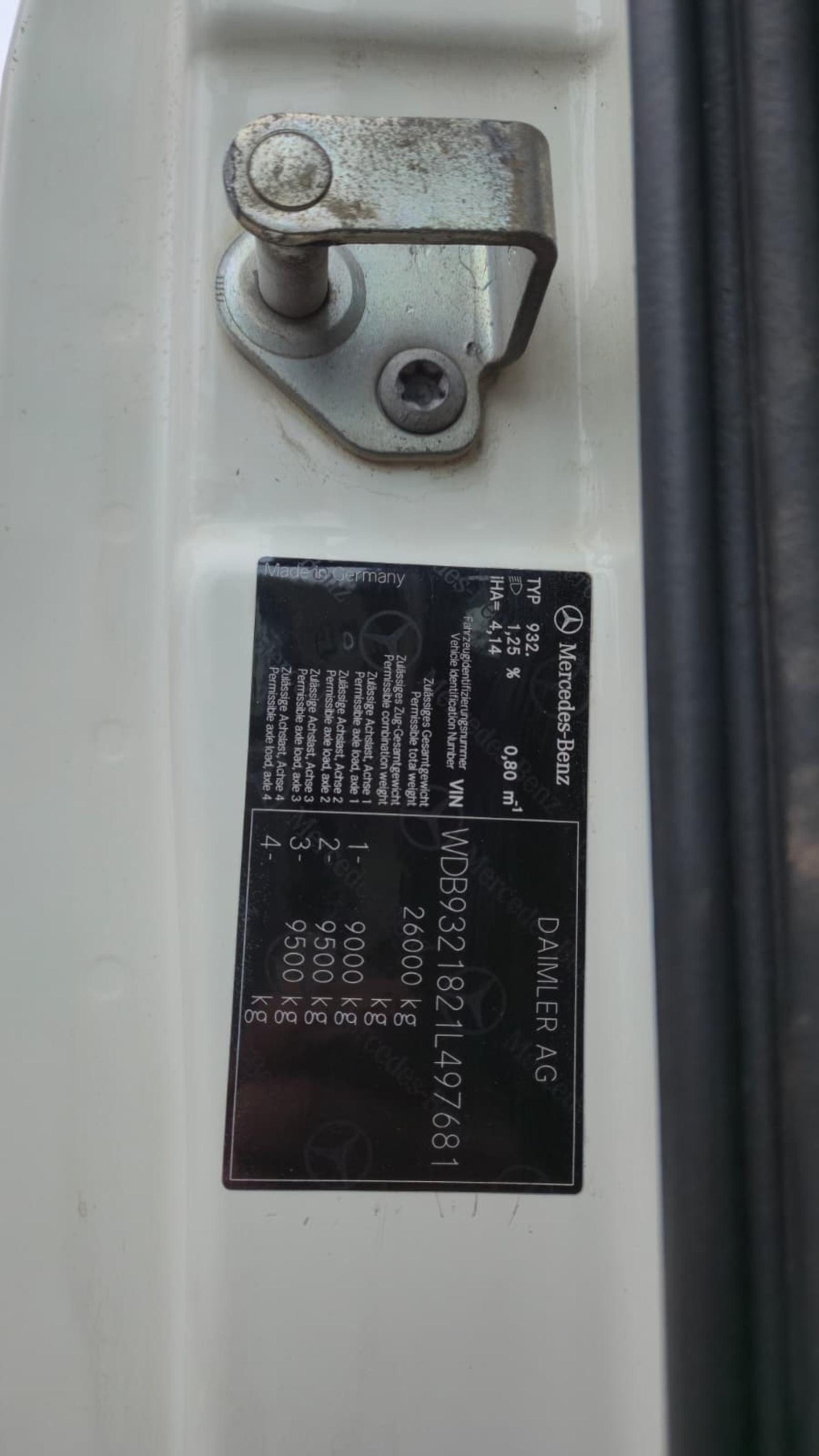 MERCEDES-BENZ ACTROS 3348 6x6 PALFINGER PK 40002 EH ID nr: 1021 ________________________________________ Dane techniczne pojazdu: • MERCEDES-BENZ ACTROS 3348 • VIN: WDB9321821L497681 • Napęd: 6x6 • Rok produkcji: 2010 • Pierwsza rejestracja: 26.10.2010 • Moc silnika: 480 KM • Norma spalin: Euro V • Przebieg: 212 081 km • Skrzynia biegów: Automatyczna ________________________________________ Specyfikacja żurawia: • PALFINGER PK 40002 EH • 5 segmentów hydraulicznych • Kosz roboczy • Sterowanie radiowe • Motogodziny żurawia: 3 037,3 h ________________________________________ Parametry techniczne: • Masa własna: 19 315 kg • Dopuszczalna masa całkowita (DMC) na Polskę: 26 000 kg • Ładowność: 6 685 kg • Długość całkowita pojazdu: 8 240 mm • Wysokość całkowita pojazdu: 3 950 mm ________________________________________ Wymiary przestrzeni ładunkowej: • Długość: 4 000 mm • Szerokość: 2 480 mm • Wysokość: 600 mm ________________________________________ Rozstaw osi: • Oś 1–2: 3 600 mm • Oś 2–3: 1 350 mm ________________________________________ Zawieszenie: • Przód: mechaniczne • Tył: mechaniczne ________________________________________ Wyposażenie dodatkowe: • ABS • Centralny zamek • CD • Elektryczne szyby • Hak/Zaczep • Immobilizer • Komputer pokładowy • Radio fabryczne • Tachograf • Wspomaganie kierownicy • Klimatyzacja ________________________________________ Opcje dodatkowe: • Pojazd wyposażony w kosz roboczy ________________________________________ Usługi serwisowe: • Autoryzowany serwis żurawi marek FASSI, HIAB, EFFER i innych • Naprawy żurawi wszystkich marek oraz samochodów ciężarowych • Dostępność części zamiennych ________________________________________ Badania techniczne i certyfikaty: • Posiadamy uprawnienia Urzędu Dozoru Technicznego (UDT) • Przeprowadzamy badania dozorowe i uzgadniamy dokumentację z UDT • Realizujemy pierwsze badania techniczne pojazdu na Stacjach Diagnostycznych ________________________________________ Gwarancja i przygotowanie do eksploatacji: • Możliwość zakupu gwarancji technicznej za dopłatą • Profesjonalne przygotowanie pojazdu i żurawia do pracy ________________________________________ Finansowanie: Oferujemy pomoc w organizacji leasingu lub kredytu na zakup pojazdu – zapytaj nas o szczegóły. ________________________________________ Lokalizacja: Nasza siedziba znajduje się w Starachowicach. Zapraszamy do osobistego sprawdzenia pojazdu i przeprowadzenia jazdy testowej. ________________________________________ Informacje dodatkowe: Dlaczego warto wybrać naszą ofertę? • Doświadczenie i profesjonalizm: od lat zajmujemy się sprzedażą i serwisem pojazdów terenowych 4x4, 6x6, 8x8. • Kompleksowa obsługa: zapewniamy wsparcie przy zakupie, finansowaniu i serwisowaniu pojazdu. • Gwarancja jakości: każdy pojazd przechodzi szczegółowy przegląd przed sprzedażą, co gwarantuje jego sprawność i niezawodność. ________________________________________ Więcej ofert znajdą Państwo na naszej platformie sprzedażowej: www.starsanduo-trucks.com ________________________________________ Nie czekaj – skontaktuj się z nami już dziś i umów na prezentację pojazdu! ________________________________________ Informacje prawne: Niniejsze ogłoszenie ma charakter wyłącznie informacyjny i nie stanowi oferty w rozumieniu art. 66 § 1 Kodeksu cywilnego. Nasza firma nie ponosi odpowiedzialności za drobne błędy, niepełne informacje lub nieaktualność ogłoszenia.