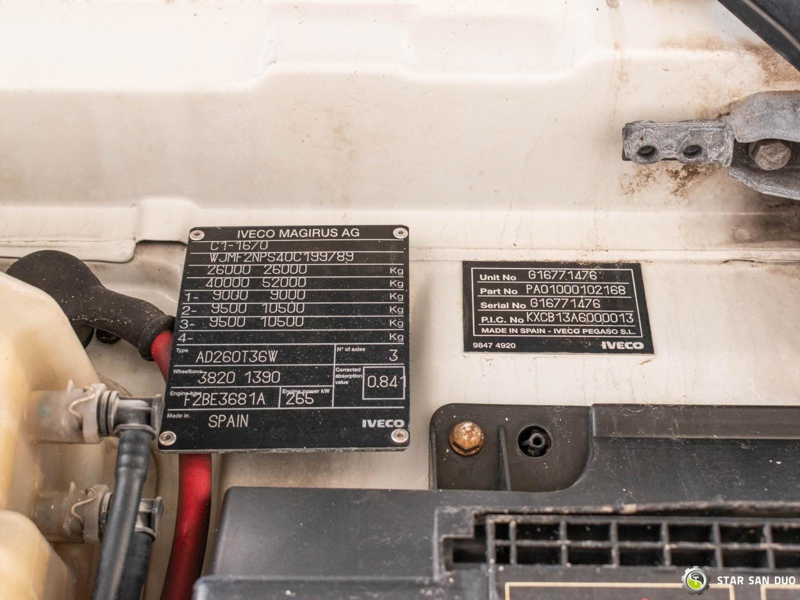 IVECO TRAKKER 360 6x6 PALFINGER PK 36002 ID no.: 963 ________________________________________ Vehicle technical data: • Model: Iveco Trakker 360 • VIN: WJMF2NPS40C199789 • Drive: 6x6 • Year of production: 2007 • First registration: 27.03.2008 • Engine power: 360 HP • Emission class: Euro 5 • Mileage: 285 007 km • Gearbox: manual ________________________________________ Crane specification: • Palfinger PK 36002 D • 6 hydraulic extensions • Radio control • Rotator • Winch on the crane ________________________________________ Technical parameters: • Own weight: 18 135 kg • Payload: 7 865 kg • Gross vehicle weight (GVW) for Poland: 26 000 kg ________________________________________ Cargo bed dimensions: • Length: 5000 mm • Width: 2460 mm • Height: 800 mm ________________________________________ Wheelbase: • Axle 1–2: 3820 mm • Axle 2–3: 1390 mm ________________________________________ Suspension: • Front: mechanical • Rear: pneumatic ________________________________________ Additional equipment: • Tipper • Radio • Air conditioning • Crane remote control ________________________________________ Additional options: • Upon the customer's request and for an additional fee, we can prepare and equip the vehicle with the single rear wheels shown in the photos as well as the cargo bed with a hand winch. ________________________________________ Service support: • Authorized service of FASSI, HIAB, EFFER and other cranes • Repairs of all crane brands and trucks • Availability of spare parts ________________________________________ Technical inspections and certificates: • We hold full UDT certification • We perform UDT inspections and documentation approvals • We carry out first technical inspections at diagnostic stations ________________________________________ Warranty and preparation: • Optional technical warranty available • Professional preparation of vehicle and crane for work ________________________________________ Financing: We can assist in arranging leasing or credit for the purchase of this vehicle. ________________________________________ Location: Our headquarters is located in Starachowice, Poland. We invite you to inspect the vehicle in person and take a test drive. ________________________________________ Additional information: Why choose us? • Experience & professionalism: we specialize in sales and service of 4x4, 6x4, 6x6, 8x8 vehicles. • Comprehensive support: purchase, financing, service. • Quality guarantee: every vehicle undergoes detailed inspection before sale. ________________________________________ More offers available at: www.starsanduo-trucks.com ________________________________________ Don't wait – contact us today and schedule a presentation! ________________________________________ Legal notice: This announcement is for informational purposes only and does not constitute a commercial offer within the meaning of Polish law. The company is not responsible for minor errors or outdated information.