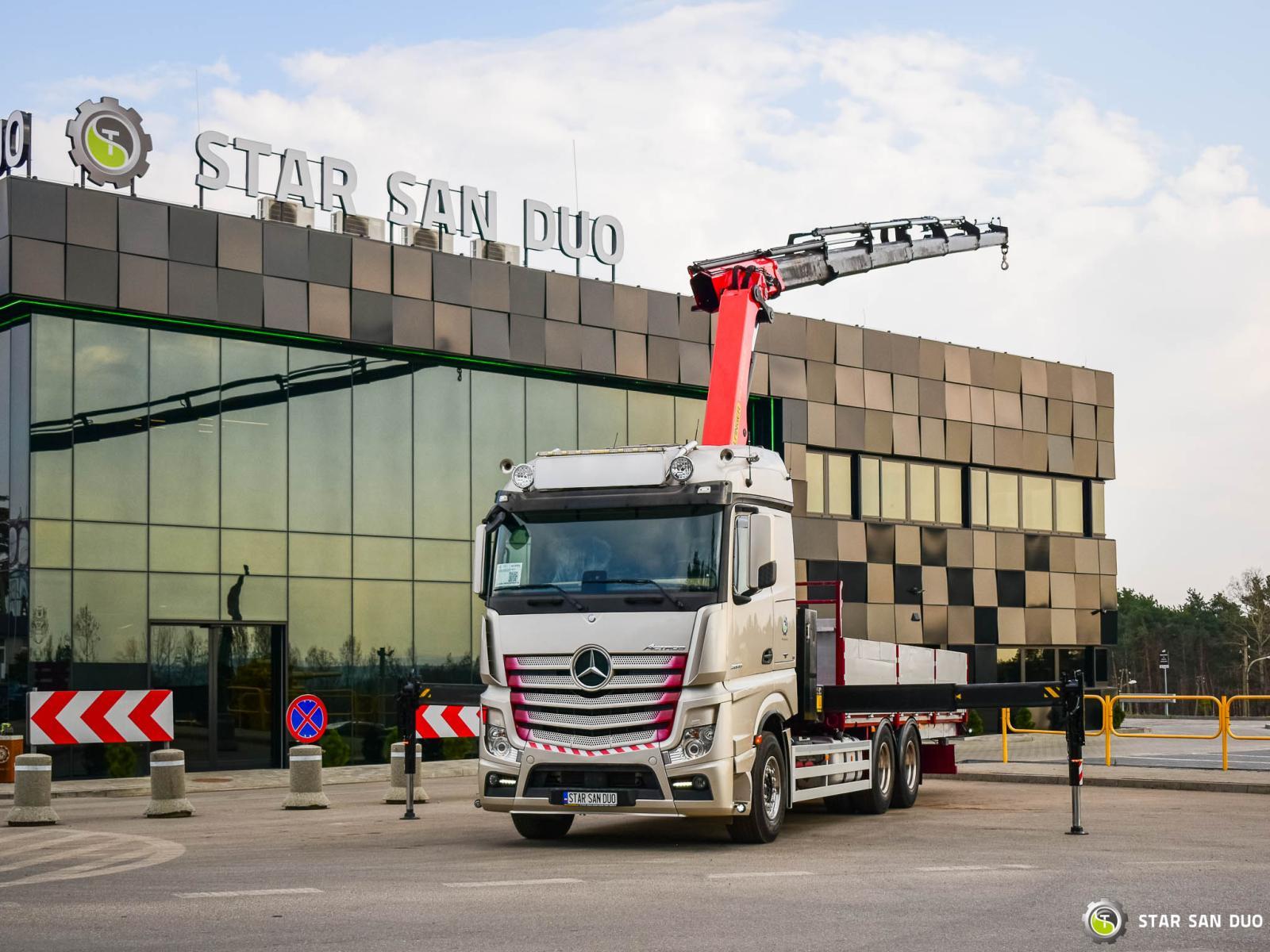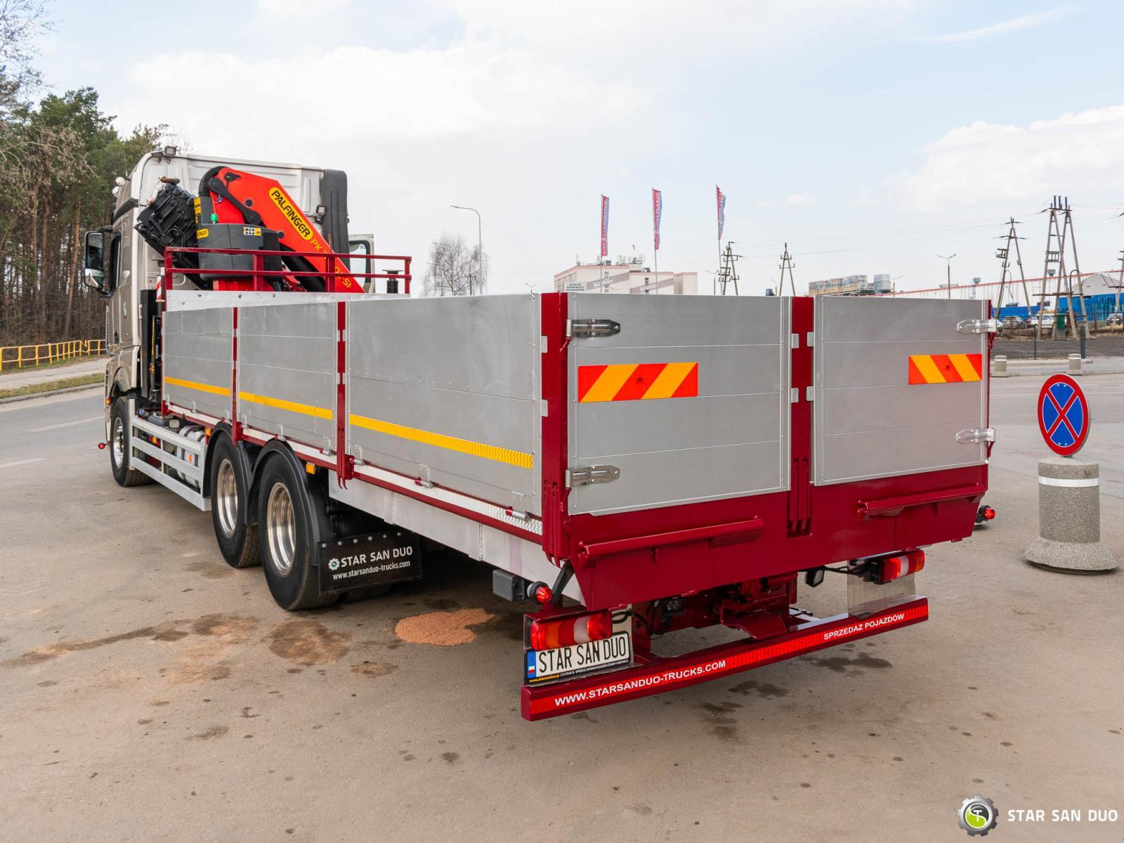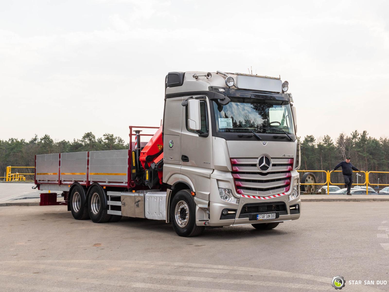ID No.: 1072 MERCEDES-BENZ ACTROS 2653 6x4 PALFINGER PK 34002 SH ________________________________________ Vehicle specifications: • MERCEDES-BENZ ACTROS 2653 • VIN: WDB96302410143000 • Drive: 6x4 • Year of manufacture: 2017 • First registration: 29.05.2017 • Engine power: 530 HP • Emission standard: Euro 6 • Mileage: 262,072 km • Transmission: Automatic ________________________________________ Crane specifications: • PALFINGER PK 34002 SH • 6 hydraulic lifts • Radio control • Crane operating hours: 3,390 h ________________________________________ Technical parameters: • Curb weight: 17,375 kg • Gross Vehicle Weight (GVW) in Poland: 26,000 kg • Payload: 8,625 kg ________________________________________ Cargo space dimensions: • Length: 6,700 mm • Width: • Height: 800 mm ________________________________________ Wheelbase: • 1-2: 4,600 mm • 2-3: 1,350 mm ________________________________________ Overall vehicle dimensions: • Overall length: 10,700 mm • Overall height: 3,700 mm ________________________________________ Suspension: • Front: mechanical • Rear: air ________________________________________ Additional equipment: • ABS • Central locking • CD player • Electric windows • Towbar • Immobilizer • On-board computer • Factory radio • Tachograph • Power steering • Air conditioning ________________________________________ Additional options: • Bodywork Box truck with aluminum sides ________________________________________ Services: • Authorized service for cranes from FASSI, HIAB, EFFER, and others • Repairs of all brands of cranes and trucks • Spare parts available ________________________________________ Technical inspections and certificates: • We are authorized by the Office of Technical Inspection (UDT) • We conduct inspections and coordinate documentation with UDT • We conduct initial vehicle technical inspections at diagnostic stations ________________________________________ Warranty and preparation for operation: • Possibility to purchase a technical warranty for an additional fee • Professional preparation of the vehicle and crane for operation ________________________________________ Financing: We offer assistance in arranging leasing or a loan for the purchase of a vehicle – ask us for details. ________________________________________ Location: Our headquarters is located in Starachowice. We invite you to inspect the vehicle in person and take a test drive. ________________________________________ Additional Information: Why choose our offer? • Experience and professionalism: We have been selling and servicing 4x4, 6x6, and 8x8 off-road vehicles for years. • Comprehensive service: We provide support with vehicle purchase, financing, and servicing. • Quality guarantee: Each vehicle undergoes a detailed pre-sale inspection, guaranteeing its reliability and roadworthiness. ____________________________________________________ You can find more offers on our sales platform: www.starsanduo-trucks.com ____________________________________________________ Don't wait – contact us today and schedule a vehicle viewing! ____________________________________________________ Legal information: This announcement is for informational purposes only and does not constitute an offer within the meaning of Article 66 §1 of the Civil Code. Our company is not responsible for minor errors, incomplete information, or outdated information.